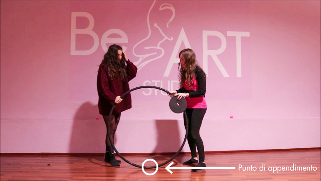 Tenendo il cerchio in piedi davanti a voi, individuate il punto di appendimento e posizionatelo verso il basso (ovvero adiacente al pavimento).